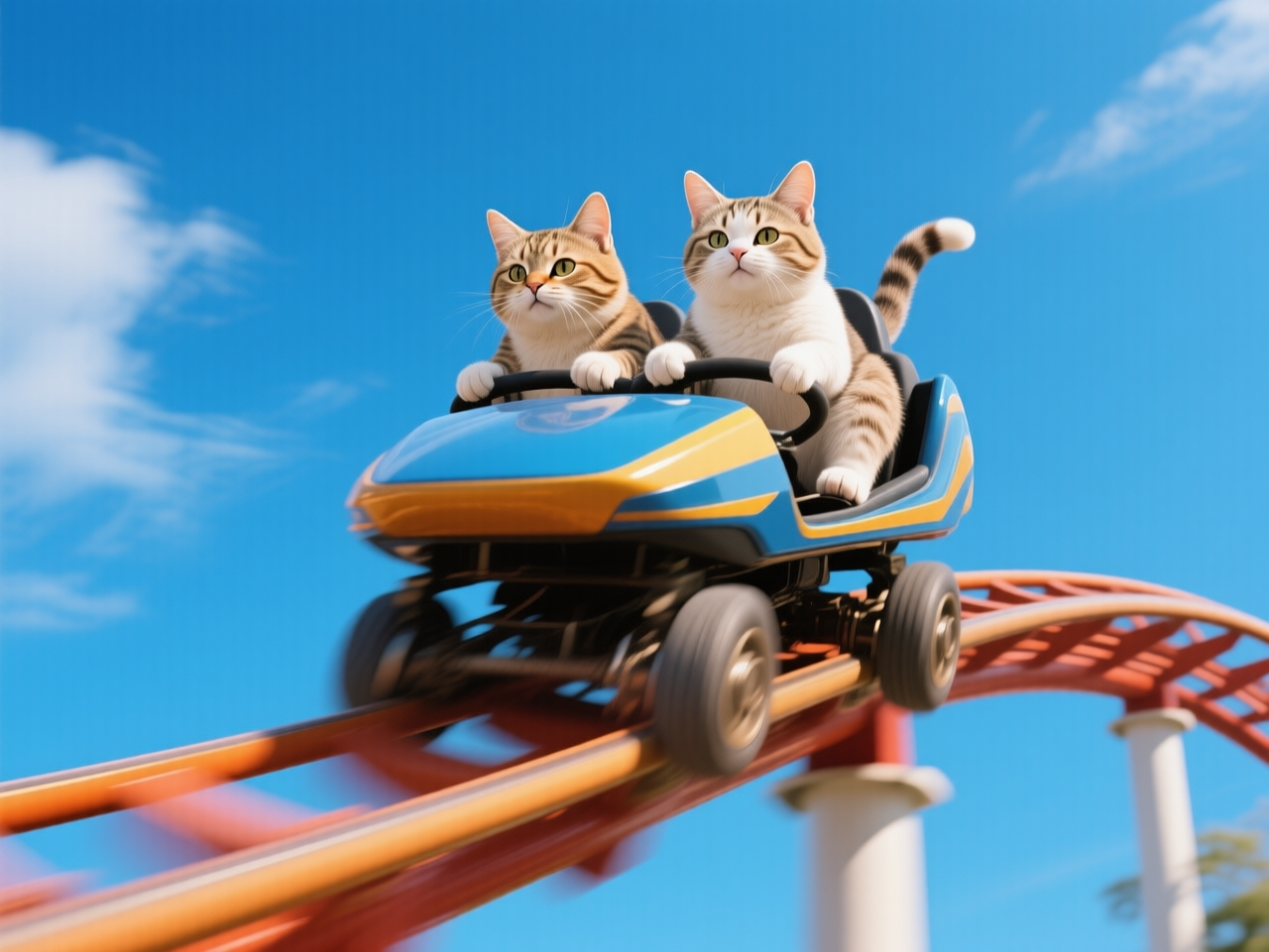 Qwen-Imageで生成したローラーコースターに乗る猫。