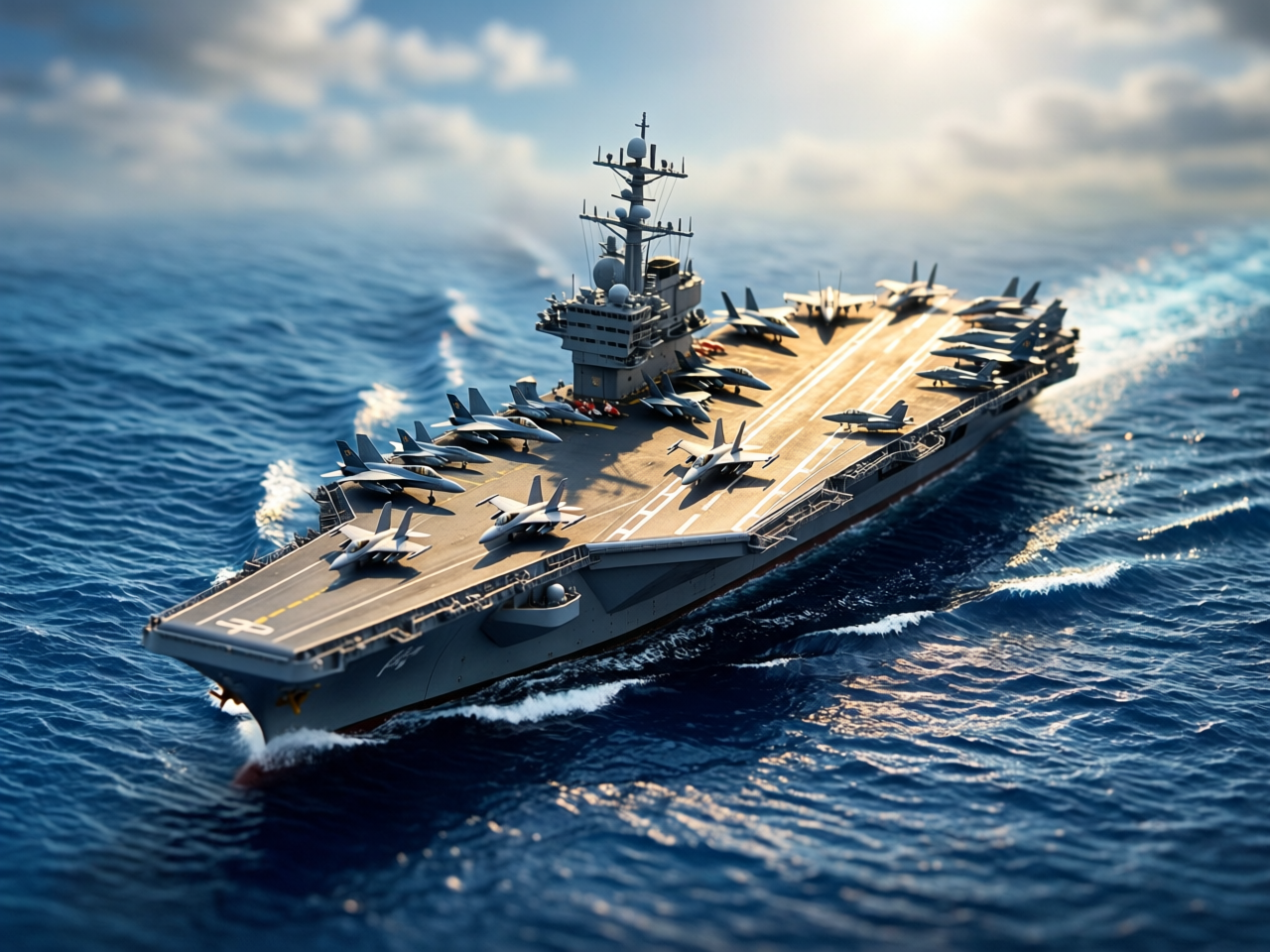 船首で波を切り、白い航跡を引きながら海を進む空母。Qwen-Image-2512でミニチュア風に生成。