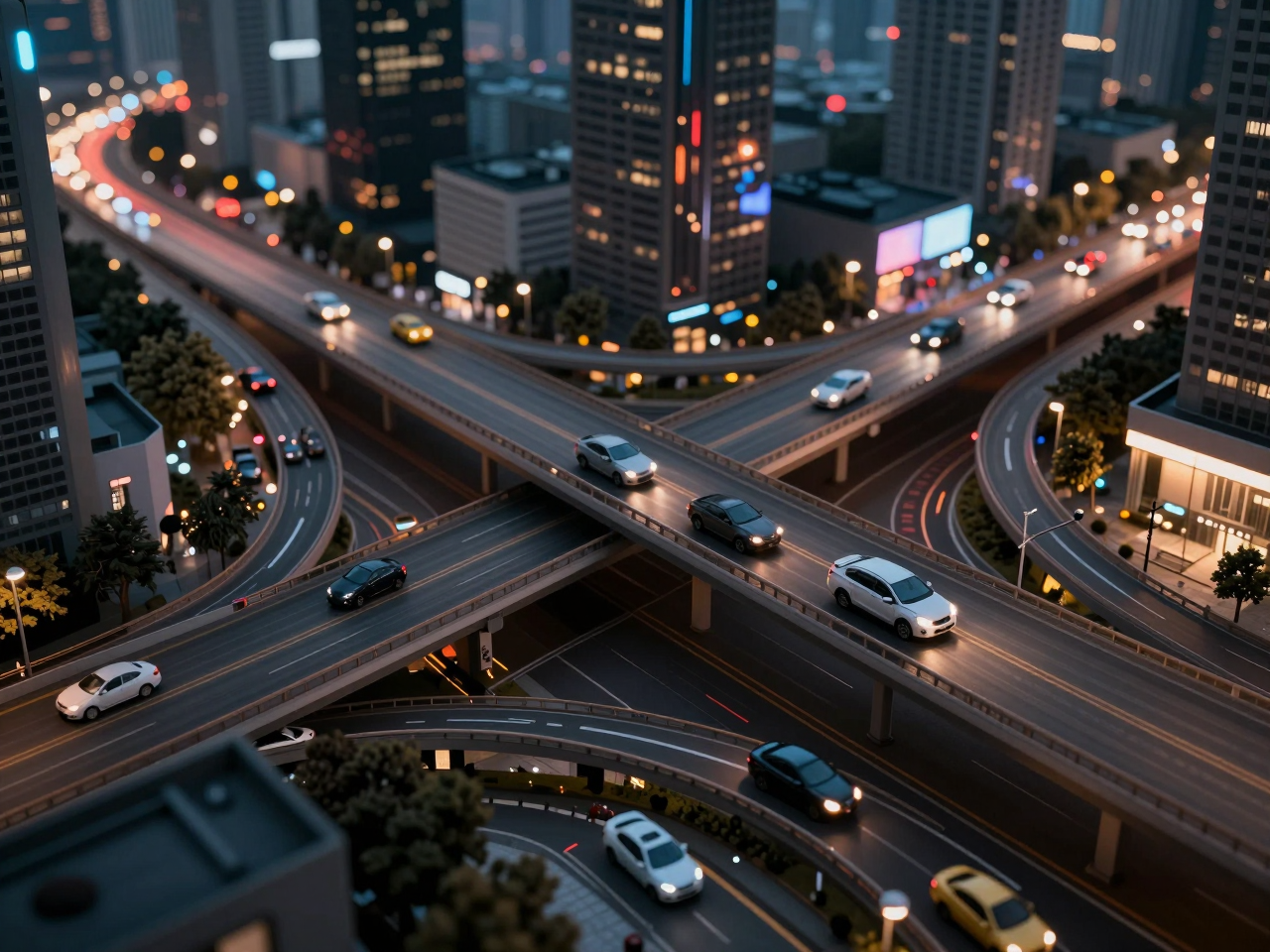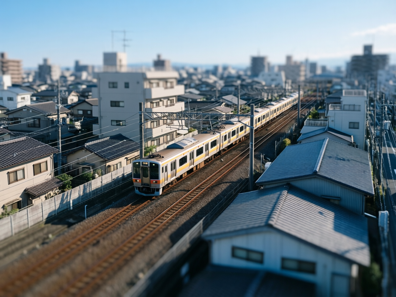 チルトシフトレンズで撮ったような電車の風景。Qwen-Image-2512で生成。