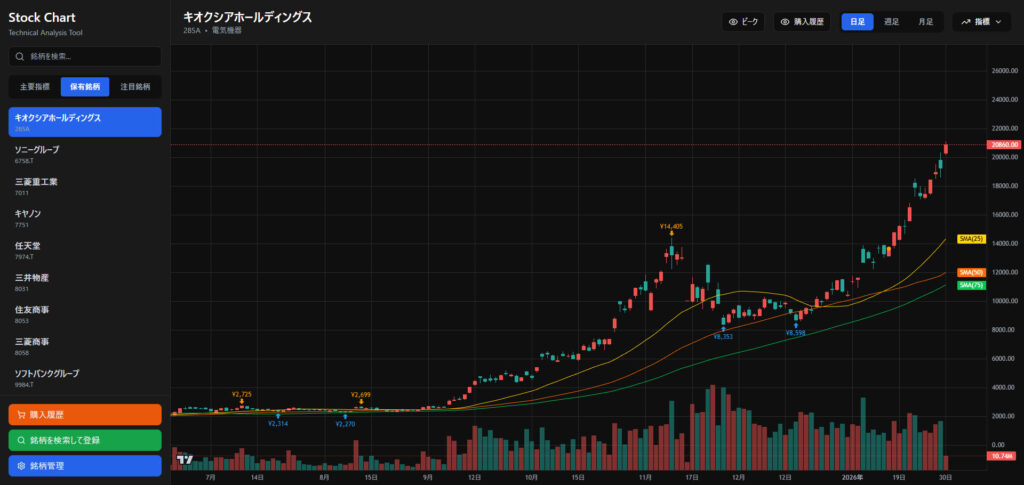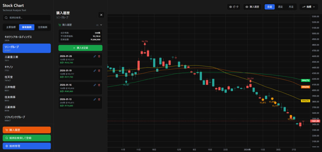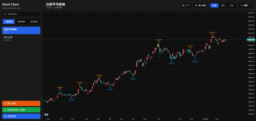 チャート上に買った場所をプロットできるようにしました。証券会社のチャートでは出来ない機能を作っていきたい。