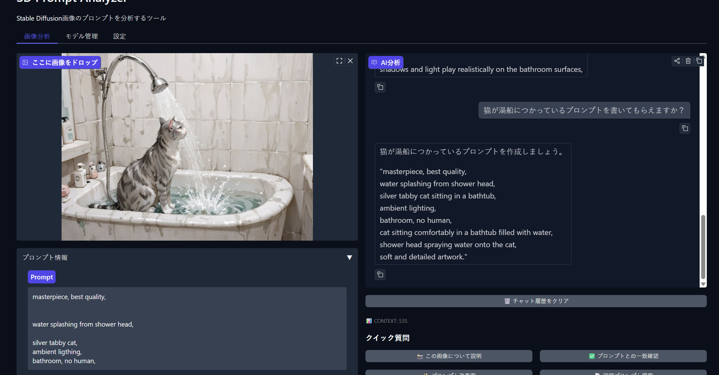 Stable Diffusionを始めたときに苦労したのはプロンプトでした。適切な単語を探すために、ウェブを検索してプロンプトのリストが載ったサイトを探したりと、やたらと時間を使いました。LLMが画像とプロンプトを同時にレビューして、さらに支援もしてくれたら楽なのになーと思ってたので、そんな悩みを解決するものを目標としてみました。