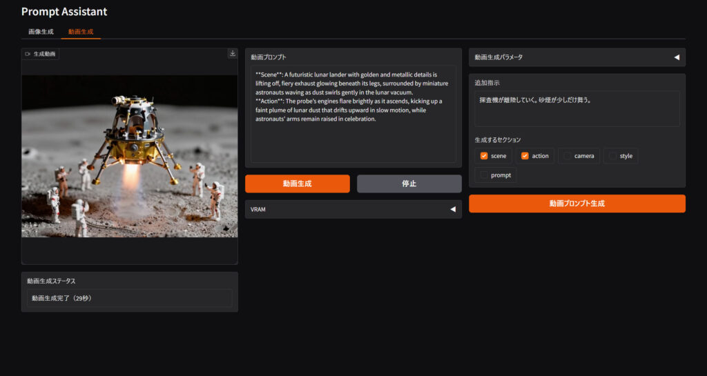 ツールをつくることでプロンプト作成もだいぶ楽になってきました。難点があるとすれば、ビジョン言語モデルに8GB、WAN2.2に30GBが必要になるので、VRAM容量は必須です。