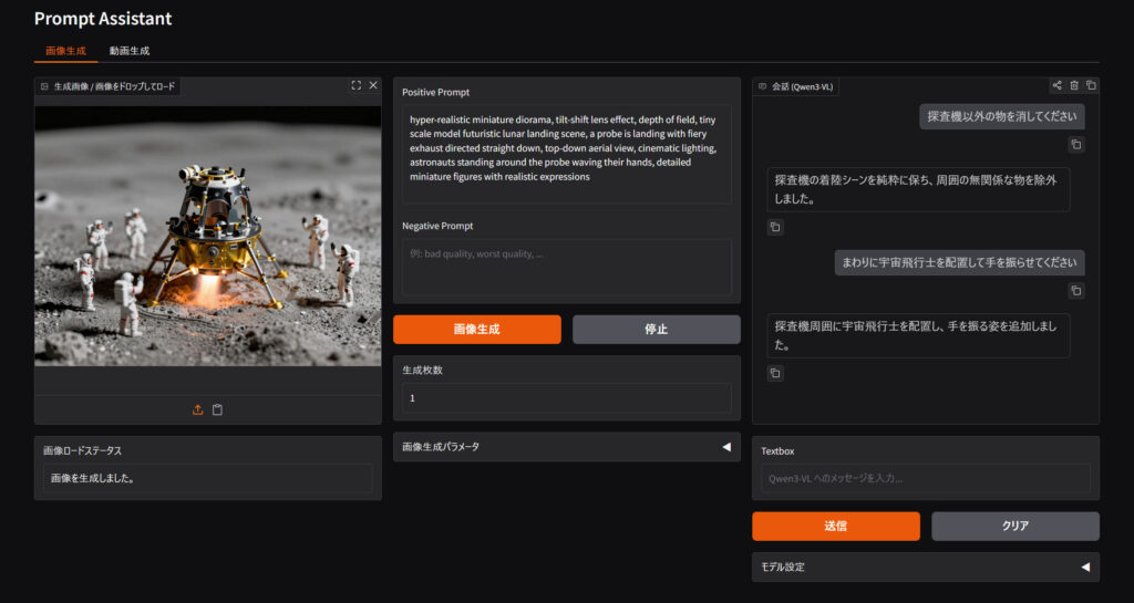 プロンプトをビジョン言語モデルと会話しながら組み立てていきます。画像生成ボタンを押せばStable DiffusionまたはComfyUIから結果が返ってくる仕組みです。生成済みの画像をドロップしてプロンプト等をロードすることもできます。