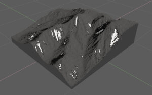 これらを乗算したマスクに、ランダムノイズを乗算して場所を限定し、Filter Sedimentsノードに発生源として入力して、流体的なエフェクトを掛けると、斜面を伸びたような地すべりのマスクになる。