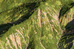 地すべりの起こりやすい場所は、谷筋や急斜面。